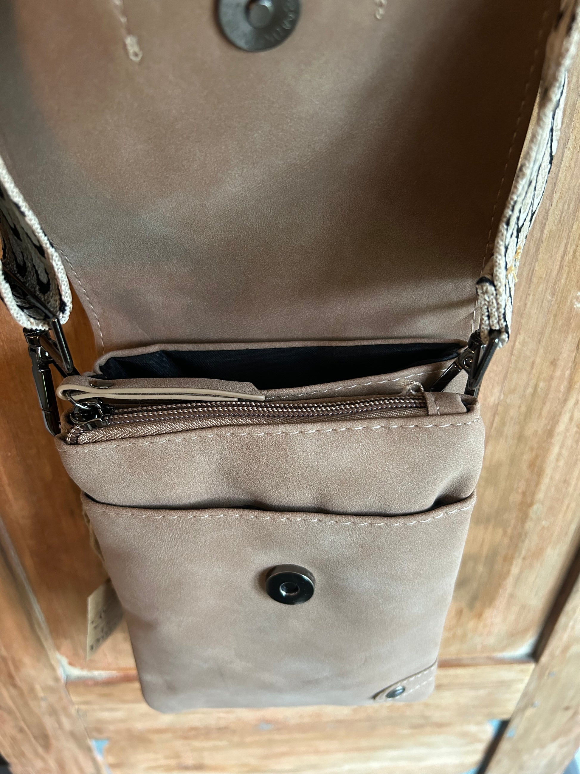 Leuk telefoontasje met 3 vakjes, een met rits. Extra band inbegrepen