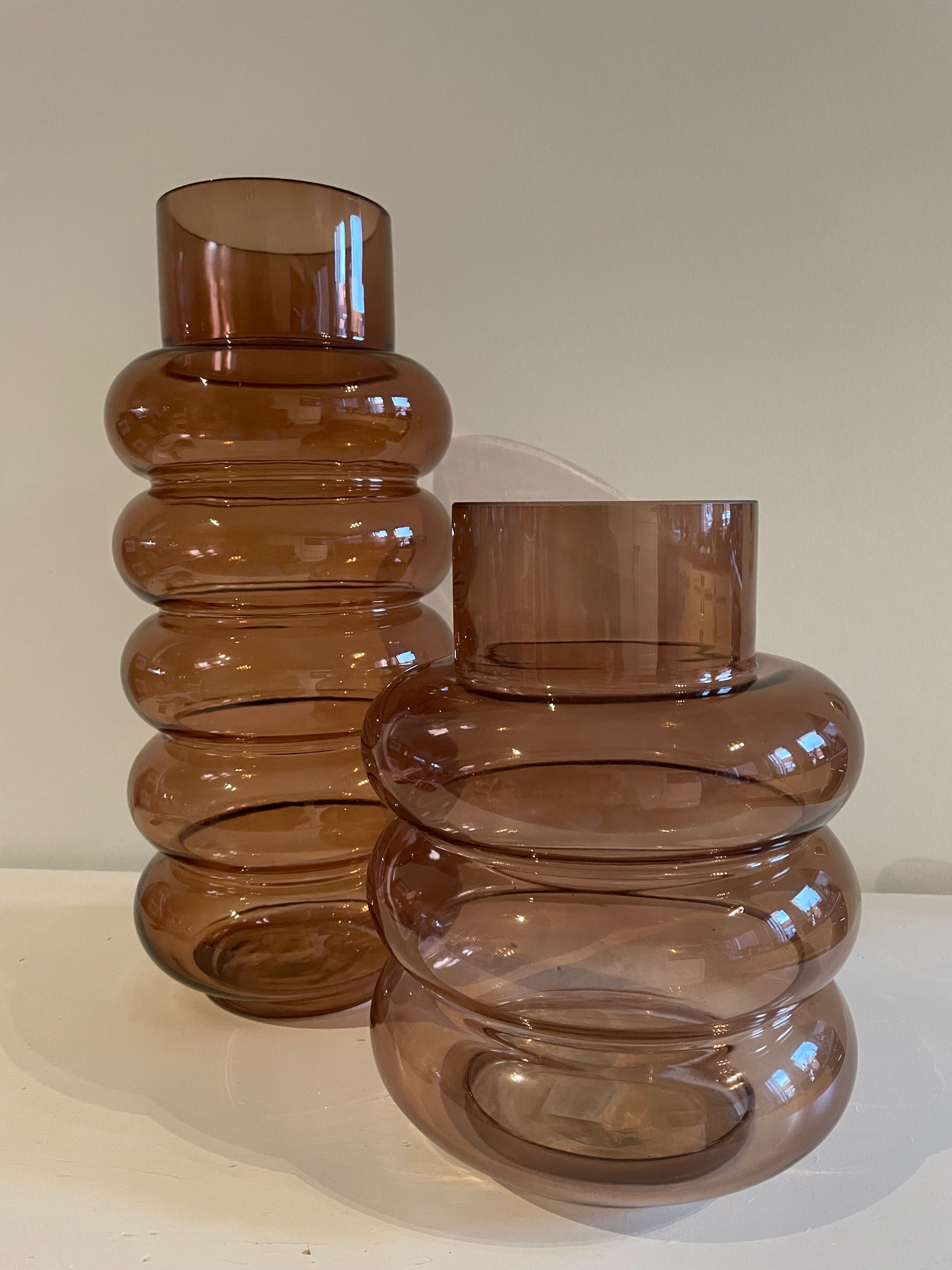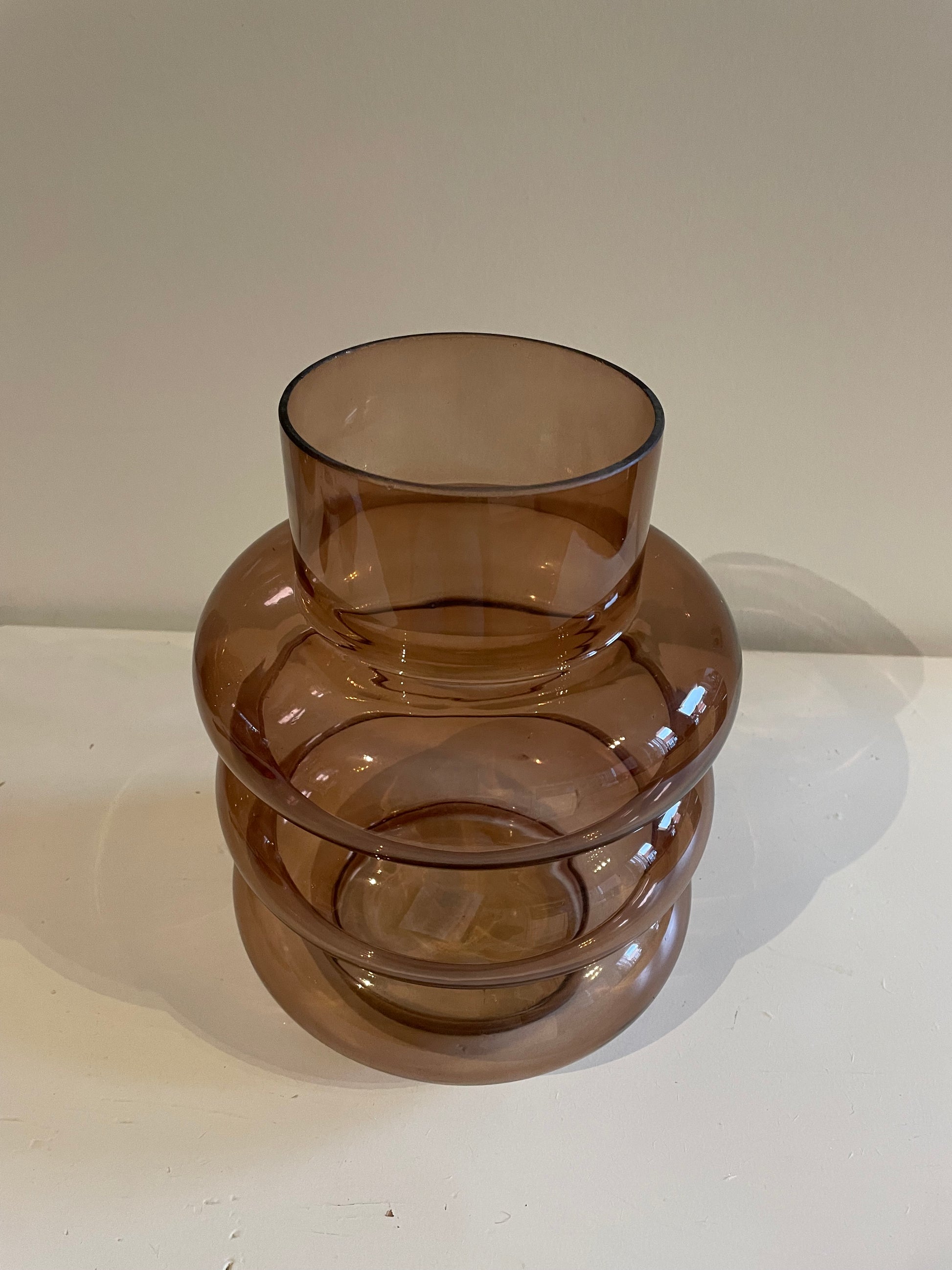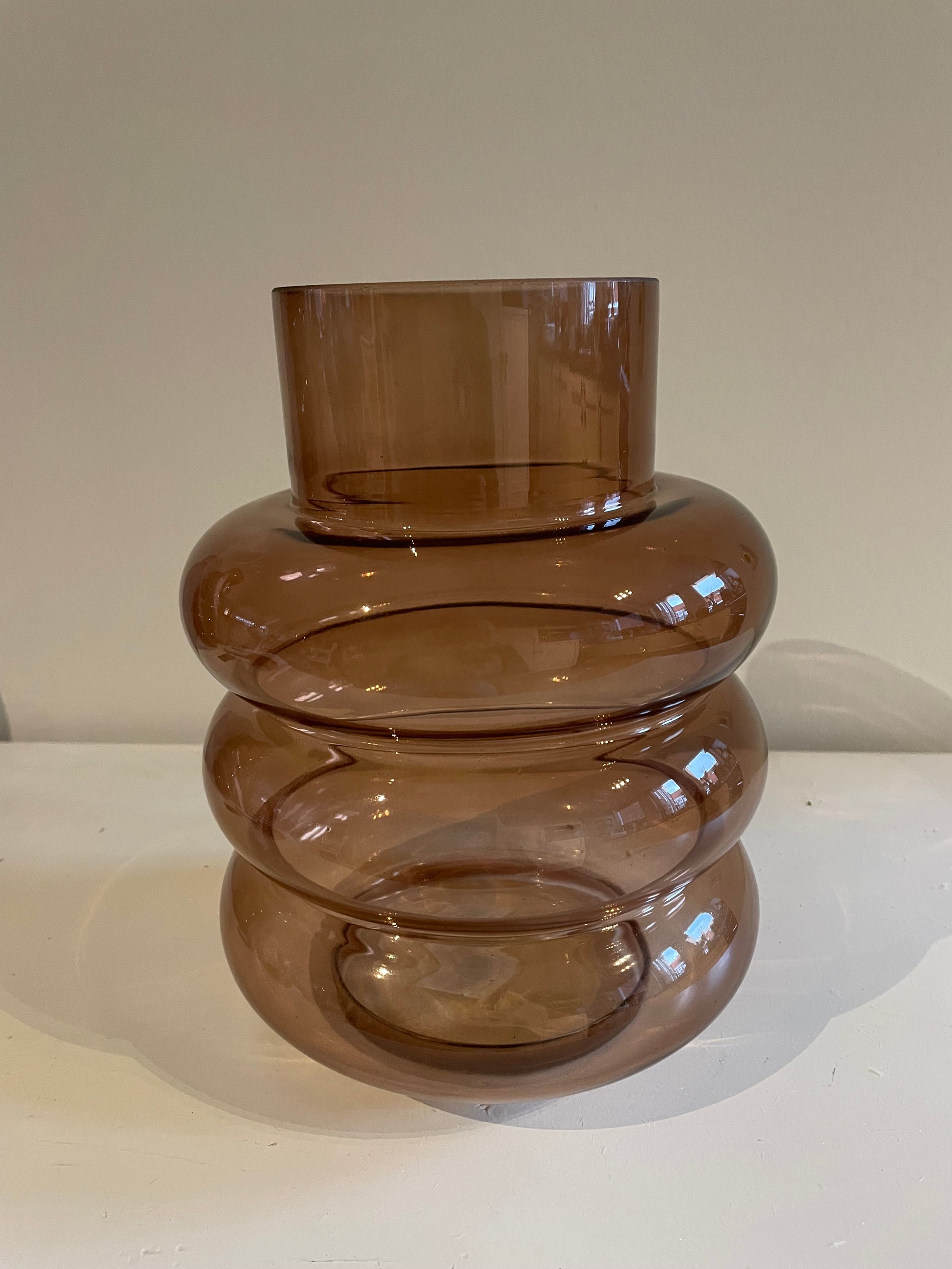 Mooie glazen vaas in de kleur Terra, lage variant. Leuk te combineren met dezelfde glazen vaas van de hoge variant.