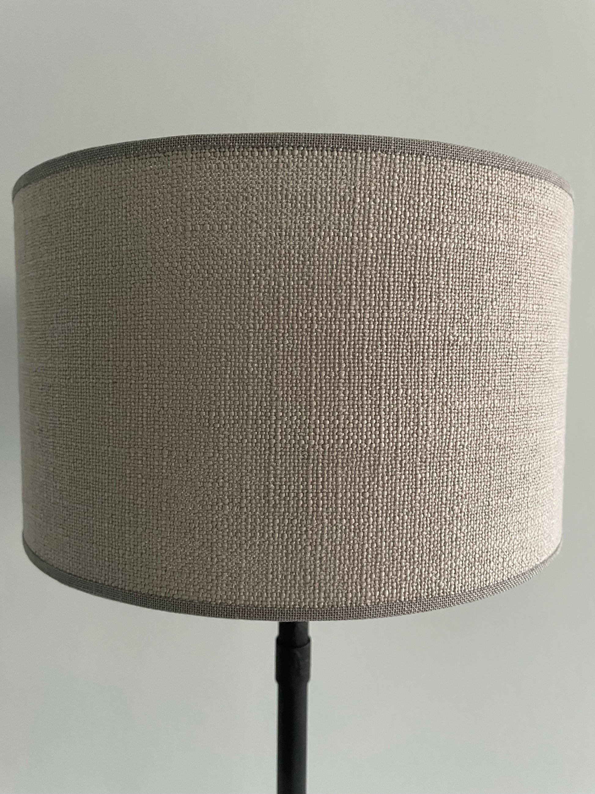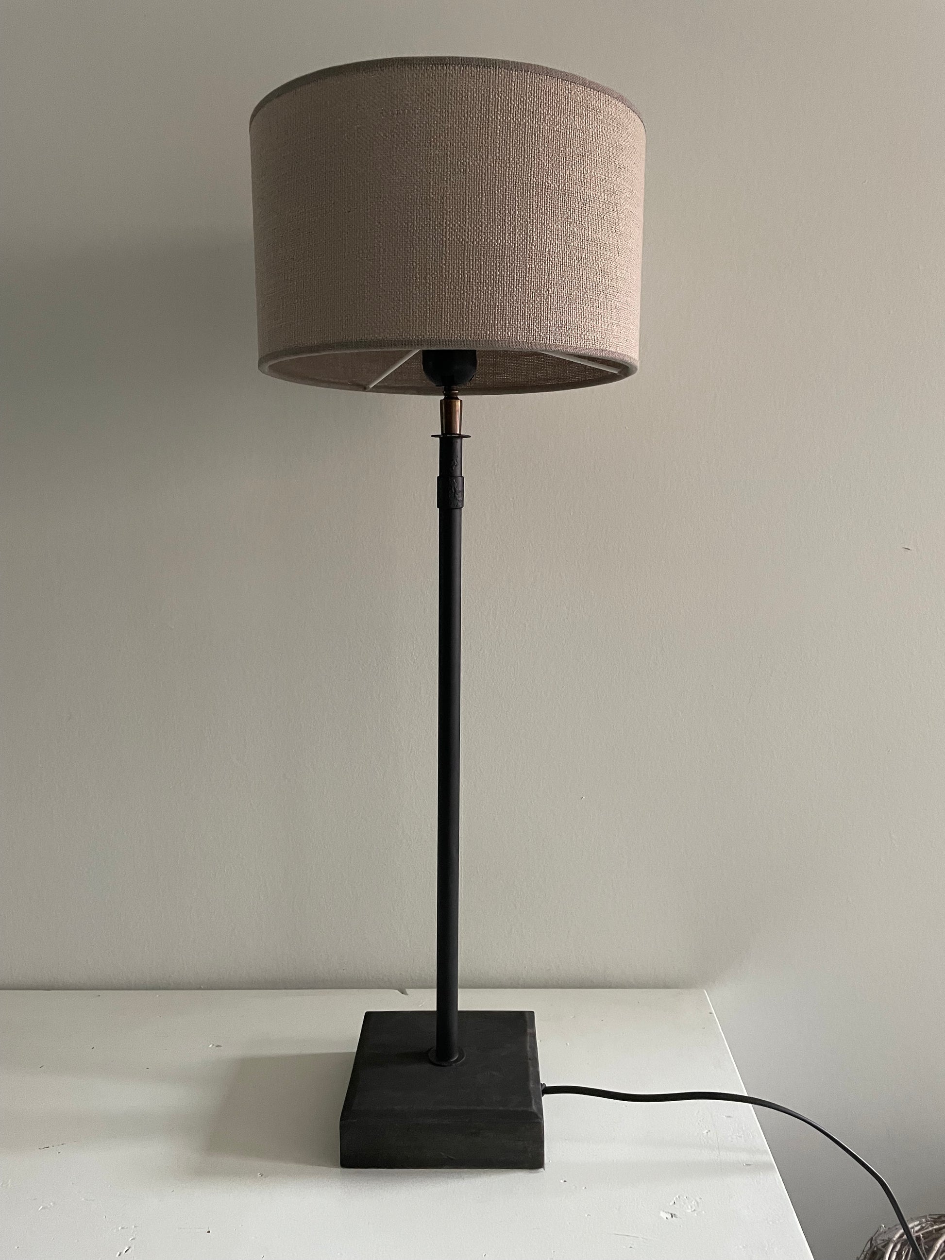 Gave staande zwarte lamp met ronde beige kap voor op een kastje of tafel, met snoer. De voet is van hout en de stang is van metaal. Ook verkrijgbaar in de medium variant.