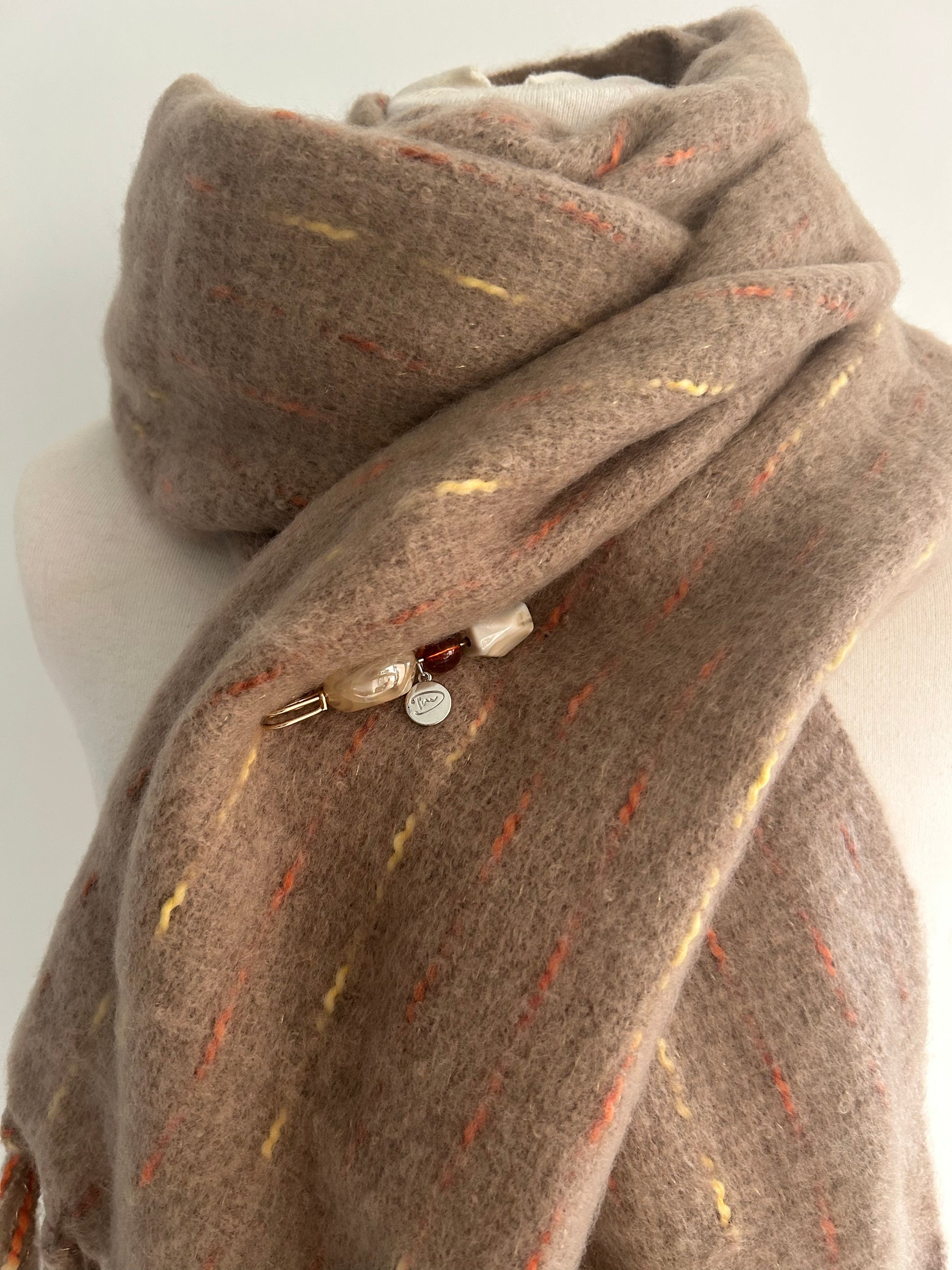 aan de uiteindes zitten franjes en incl speld om de sjaal mooi bij elkaar te houden