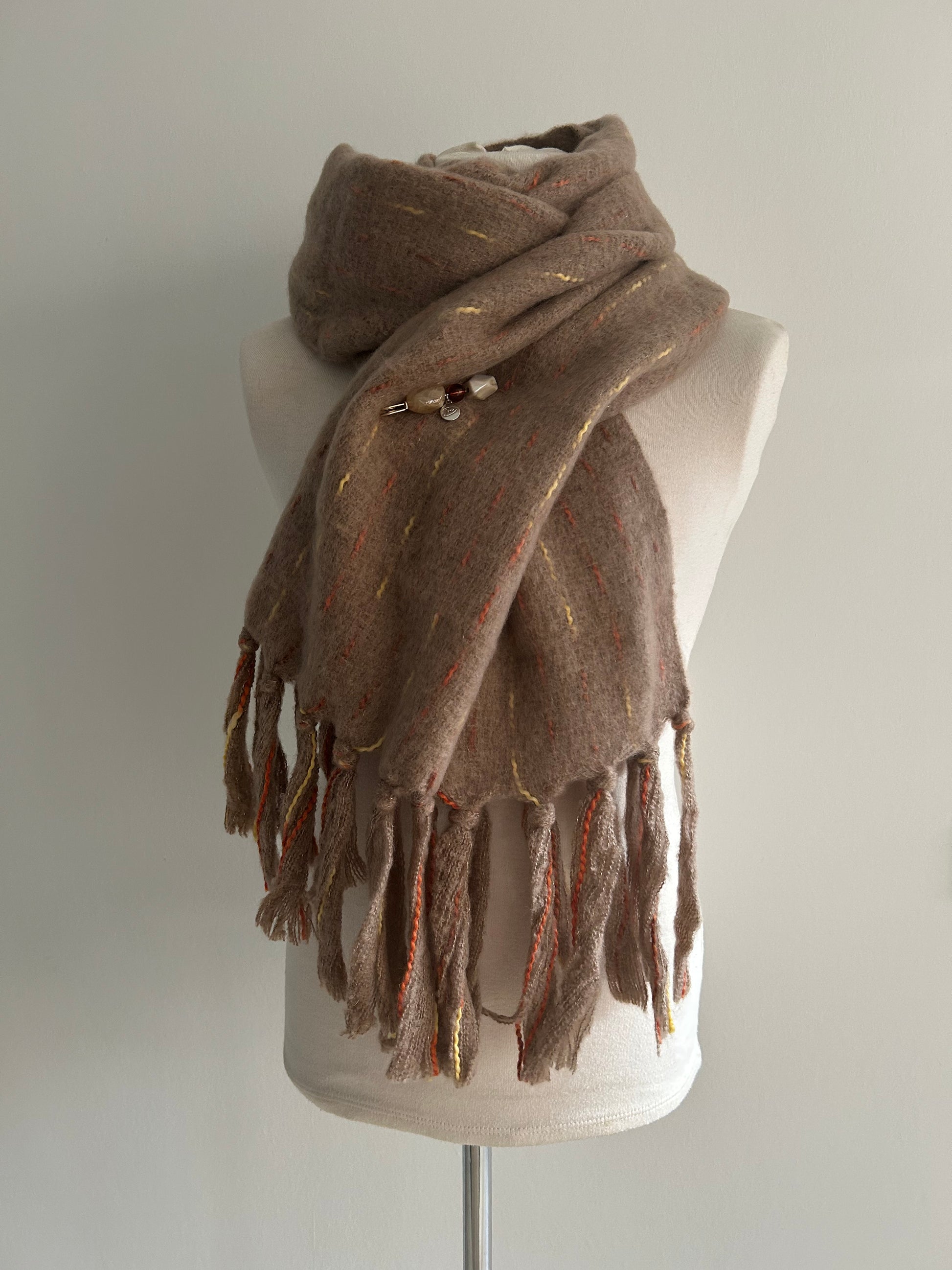 heerlijk warme sjaal met zacht geel en terra dun draadje er door geweven.