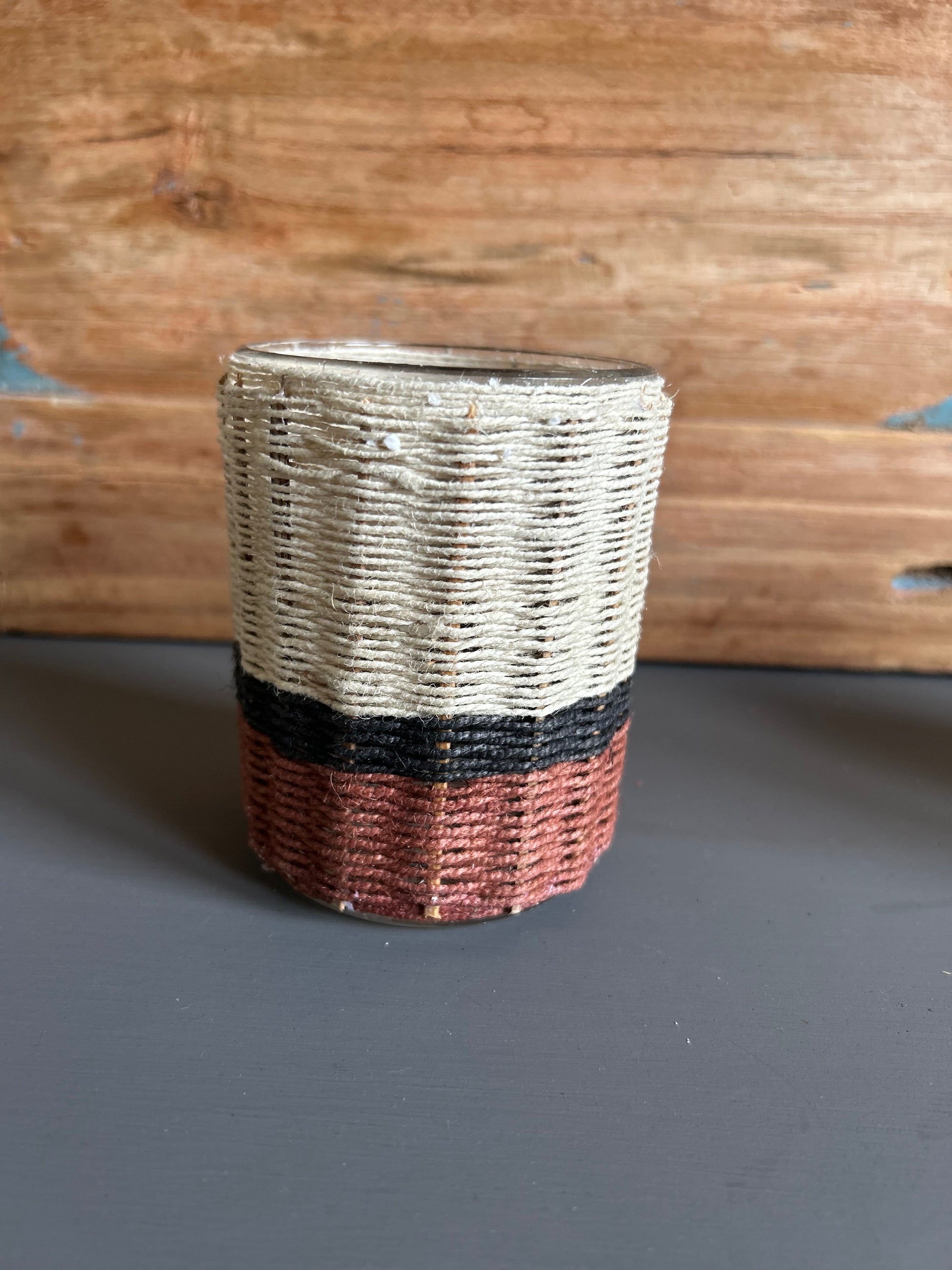 glaasje is omwikkeld met touw in ecru, zwart en rood/bruine kleuren